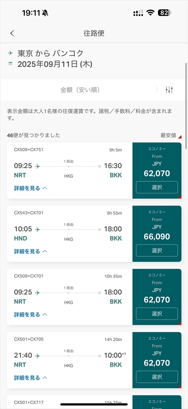 キャセイ公式でバンコク行きが6万円ちょいと意外とお安いお値段が出てまして、おっ、これいいかもと思っていたところ