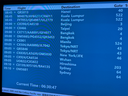 プラザプレミアムラウンジを2件ハシゴしてなんとか4時間ほど時間を潰した後、そろそろキャセイラウンジがオープンする時間になったので向かいましょう