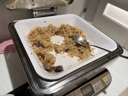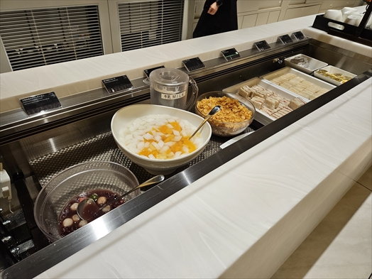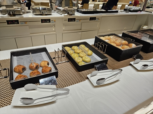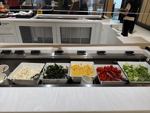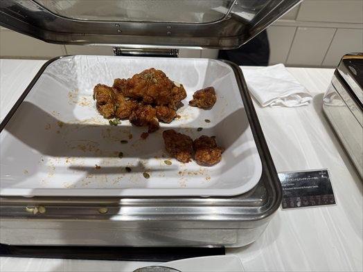 そもそも広いラウンジ内でビュッフェ台がここしかないのでお腹空かせた人々が群がって補充しても補充してもすぐ食い散らかされちゃうし、座る席に寄ってはビュッフェ台が遠いのがバッドポイント。もう1箇所あればいいのに。