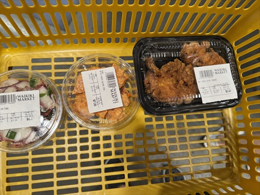 いつもおなじみワイキキマーケットでフライドチキンとポケを調達しつつ