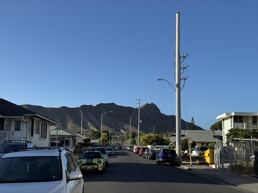 (レインボードライブイン脇の通りからみるダイヤモンドヘッドを拝む)