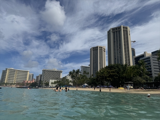 最初ハイアット前あたりで浮き輪でプカプカ浮かんでいたのですが波が意外と強くて流されております。