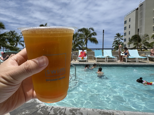 1時間ほど海に浸かって疲れたのでプールに戻って水分補給をプシューっとな。