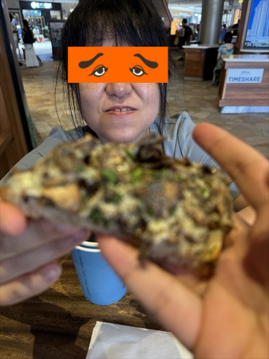 そんな可哀想な様子を見かねたのかどうか知らぬが、我々の後ろに座ったさっきのオジサンがマッシュルームのタルティーニを1切れ(と言っても結構でかい)をお裾分けしてくれました!(ピントが相席おばさんに合ってしまったがw)