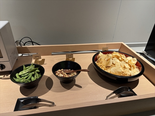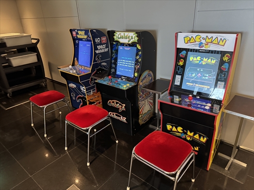 ラウンジの端っこにパックマンとかギャラガなどのアーケードマシンが置いてあって自由に遊べるのでファミコン世代のおじさんにはたまらん(アーケードのパックマンとかだともうちょい対象年齢は上かな)