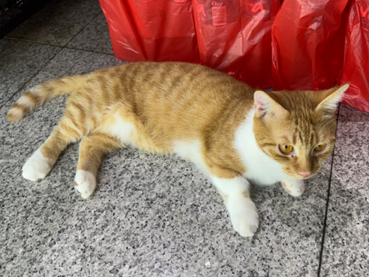 白い首とお腹周りが目立つ茶トラ系。
