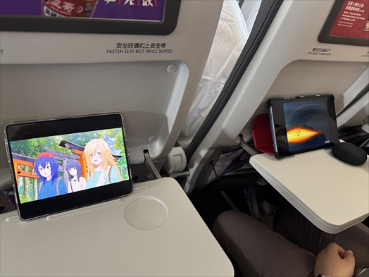 機内ではお互いタブレットにダウンロードしたアニメを視聴したりして過ごして