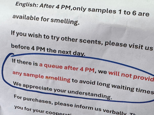 夕方4時前までならサンプルを色々を試せるみたいなのだが、4時すぎるとダメよというご案内。