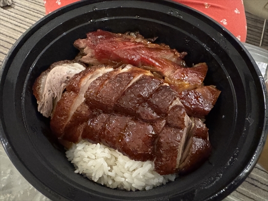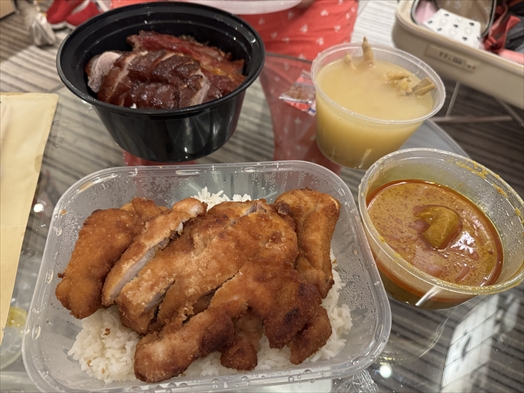 カツカレーと、ホテルへ帰る途中にあったローストダックの店(店名不明)でダック&チャーシュー飯を買ってきてもらいました。