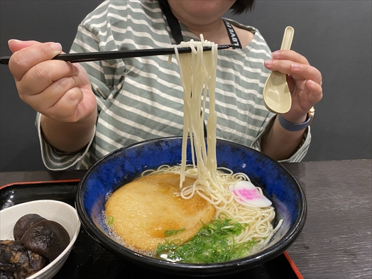 相席したおばさんはしいたけうどん細麺をチョイス。