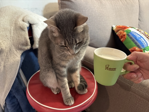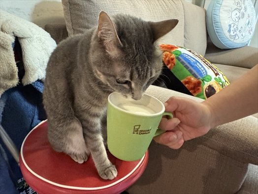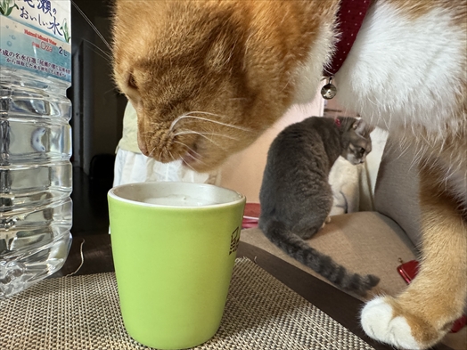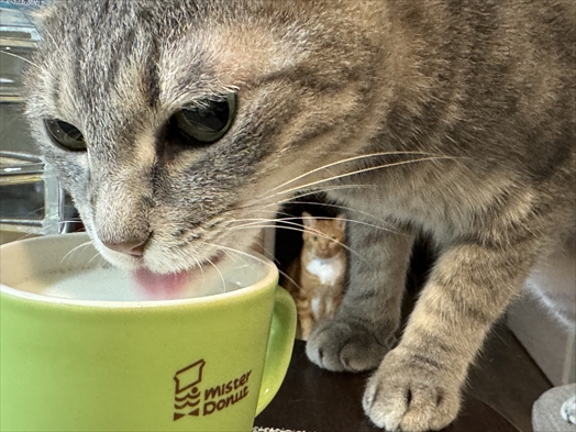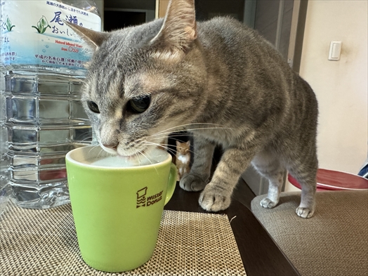 朝のルーティンで母ちゃんが飲む牛乳を横取りするお嬢。