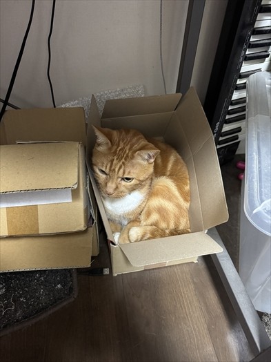 先週のネコだよりでもご紹介いたしましたトイレットペーパーが大量に入っていた箱の上で寛ぐチッさん。