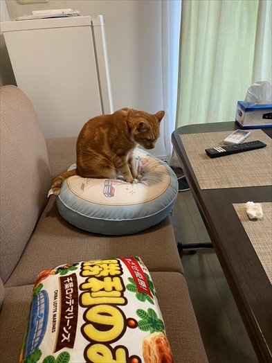 ソファの上に放置されているちいかわのクッションの上に乗ってマッサージの練習をするチッさん。