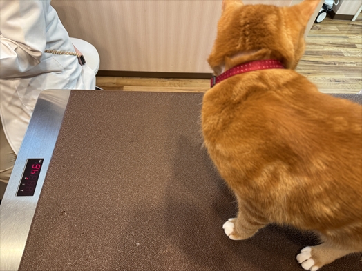 体重測定。コンマの左側が写っておりませんが5.46kgとちょい重め。体重が減るのはよくないけどちょっと増えるのは問題ないとのこと。