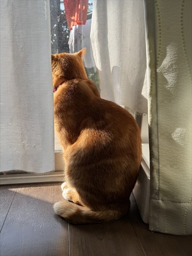 せっかく部屋を涼しくしているのに外の熱がこもる窓とカーテンの間で日光浴しながらゴロゴロしてる時が多いんですよ、最近。