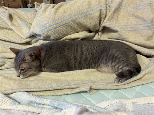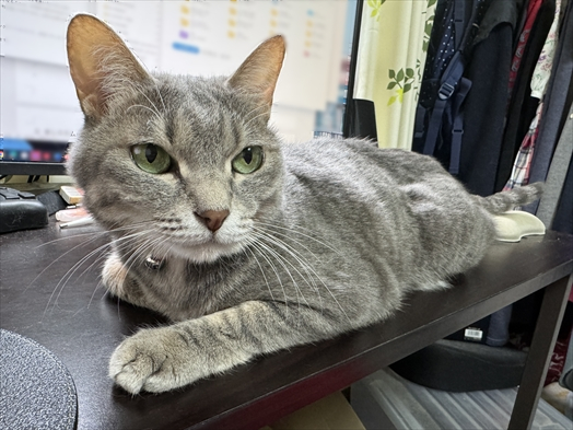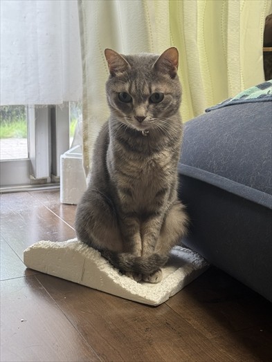 チッ太郎は書斎の扉の前に置いてある段ボールの上に乗って父ちゃんが仕事から脱走しないように見張り中。