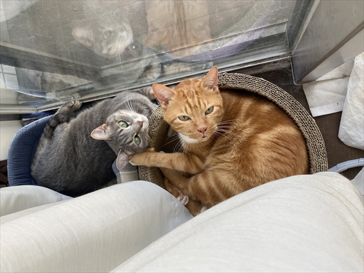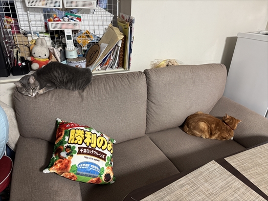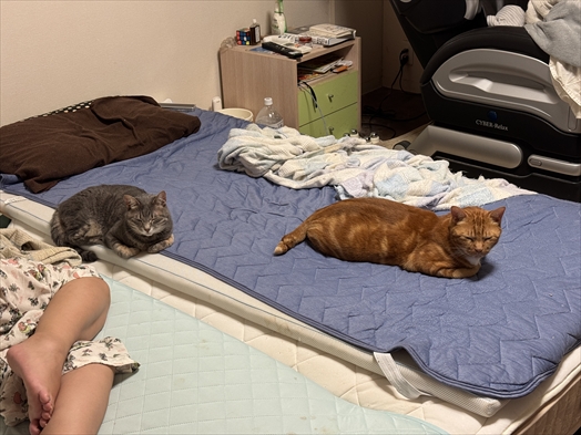 就寝時間となりました、ということでベッドにやってくるとネコズ(特に茶色)がででん!と鎮座しております。