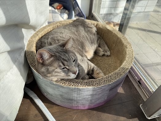 爪とぎボウルの縁に顔乗せて日向ぼっこが捗るお嬢さま。