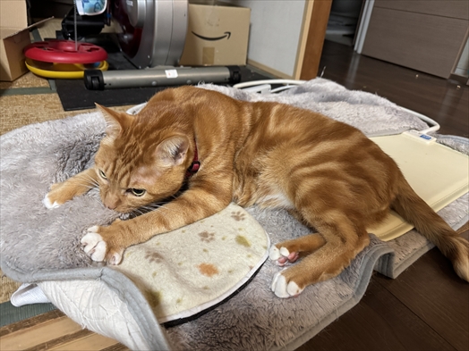 ふてぶてしい顔を見せたと思ったらホットカーペットの上で毛布フミフミをお楽しみになられております。