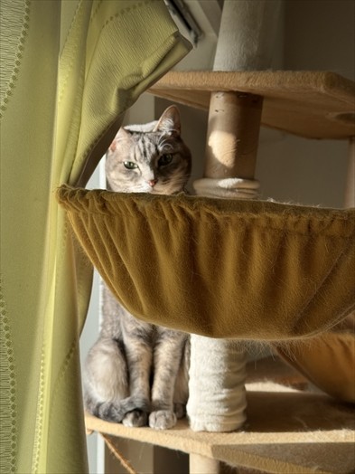 続いてはキャットタワーに河岸を移して日光浴の続きを、と思いきや何故かこちらを真剣な眼差しで見つめるお嬢。