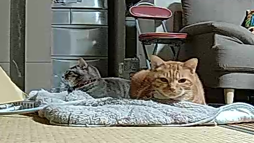 留守番中ネットワークカメラ越しにカーペットでおくつろぎになられる2人。