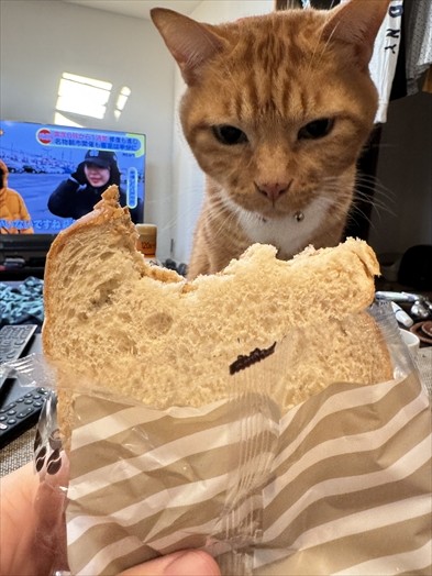 朝から父ちゃんが食べてるパンのおこぼれを貰おうとするチッ太郎氏。