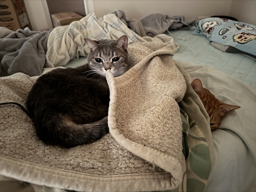 夜寝る時は母ちゃんのおふとんに集合するネコズ。