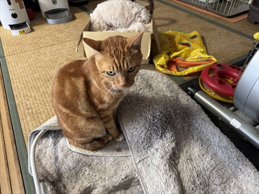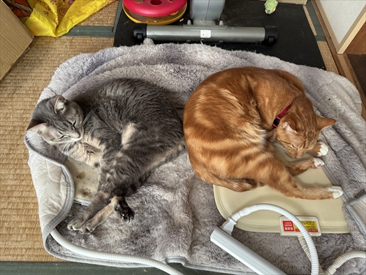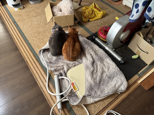 何故か1枚のホットカーペットに2人でぎゅうぎゅうになっております。
