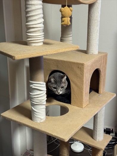 キャットタワーの低層階にすっぽり収まるインザお嬢。