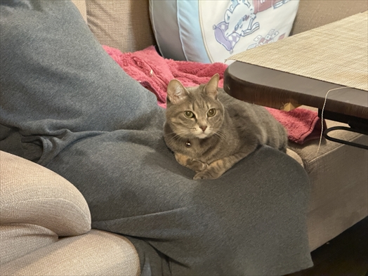 母ちゃんの太ももの上にちょこんと乗るオンザお嬢。