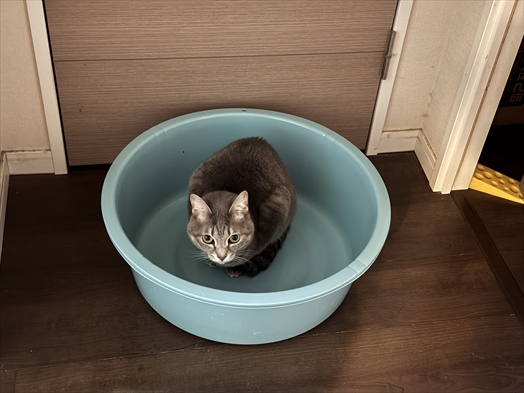 廊下にポツンと放置してあったタライにどっしり入るアットザお嬢。