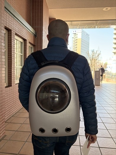 油断してホットカーペットでくつろいでいたところをエイヤ!と捕まえてリュックに押し込みました。