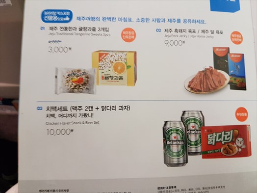 ハイネケン2本とおつまみセットが10,000ウォン(約1,000円)と(LCCの機内販売にしては)まあリーズナブルかと(買わんけど)。