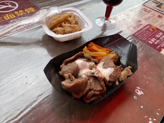 セコマのお惣菜のザンギ(奥)と肉にソースが掛かった何かは記録がないので不明(セコマのメニューになかったので別の店のかも)