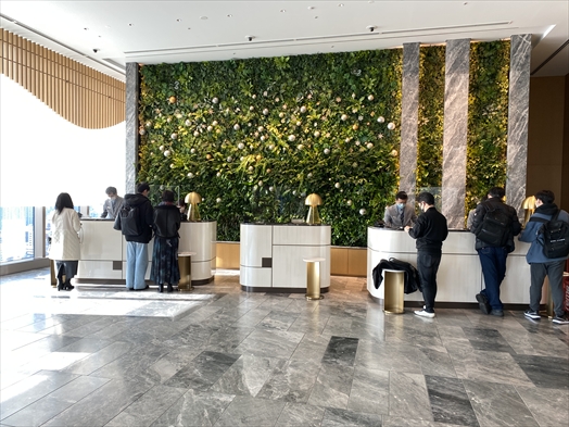 まだコロナ禍の中なのでフロントには衝立、人々はマスク装着状態。