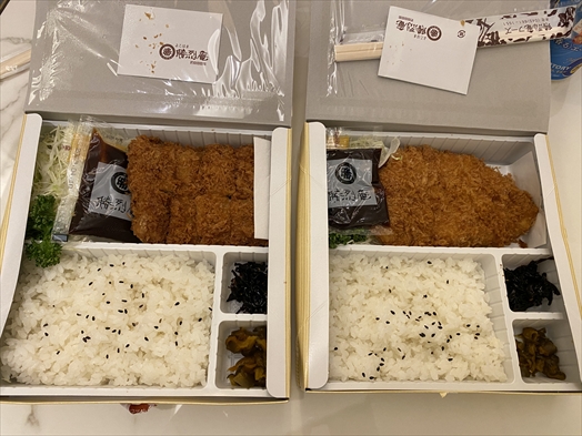 ディナーはチェックインする前によった横浜そごうで調達した勝烈庵(横浜で有名なとんかつ屋さん)の大ロースカツ弁当。